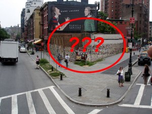 Tiles For America was started shortly after the attack. It is an empty lot owned by the MTA (M.ass T.ransit A.authority) with a simple chain link fence around it. It is right across the street from what used to be 150 year old St. Vincent’s Hospital. (I say ‘used to be’, because greedy politicians such as Mayor Bloomberg and councilwoman Christine Quinn saw to it that after the hospital went bankrupt in 2010 – it was quickly turned into a giant condominium complex, leaving all of Greenwich Village and lower west side Manhattan without a hospital.) St. Vincent’s handled the cholera epidemic of 1849, took in the only survivors of The Titanic. It was at the center of the AIDS epidemic and took in the first survivors of the World Trade Center 9/11 attack and in 2009 cared for the passengers of ‘the miracle on the Hudson‘ – the landing of Airways flight 1549 by Capt. Chesley B. Sullenberger III. The poet Edna St. Vincent Millay got her middle name from the hospital.