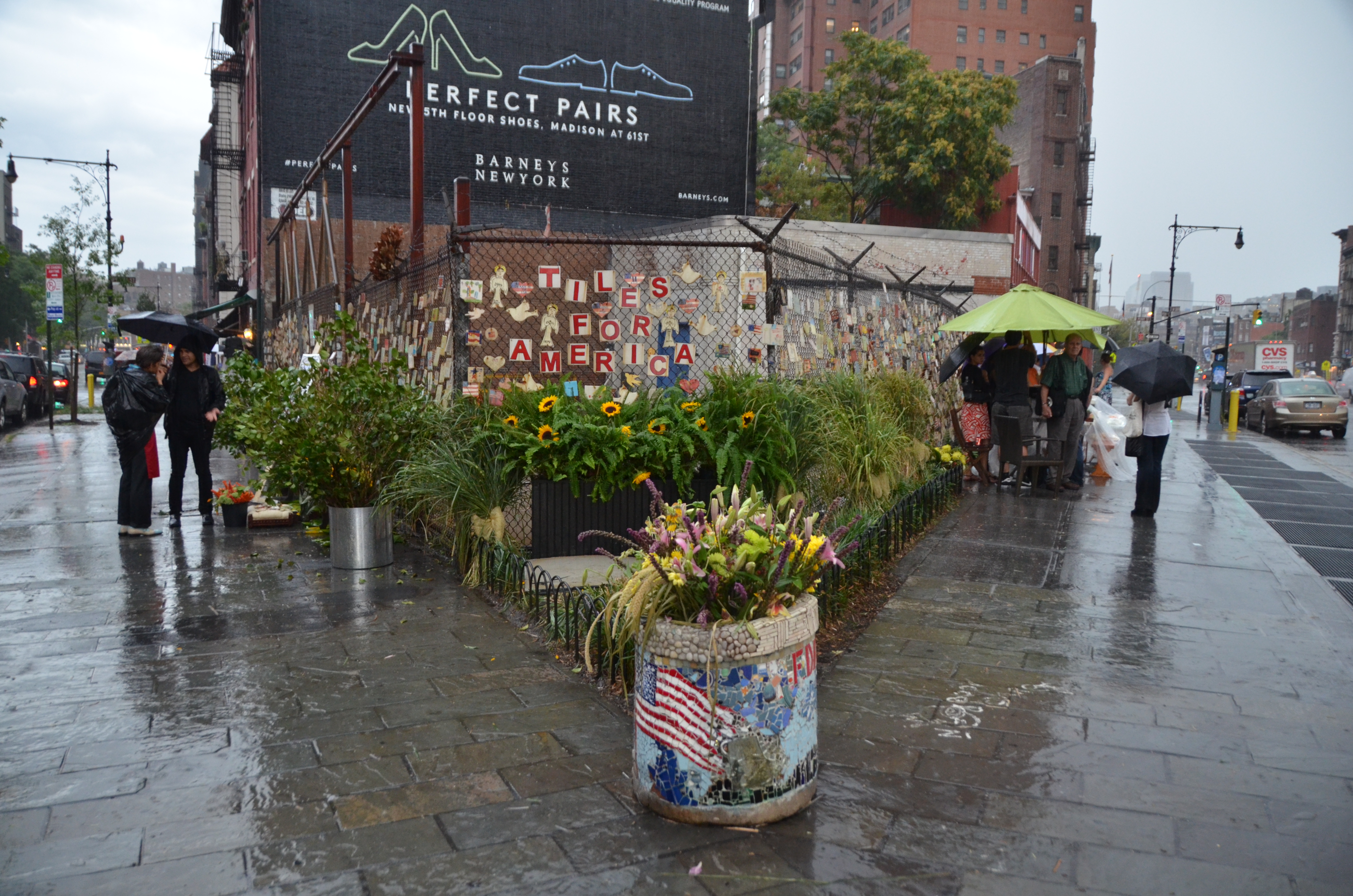 ‘Our Name Is Mud’ sadly went out of business, but right around the corner, lives Dusty Berke, a long time Greenwich Village resident who was and is determined to preserve the tiles memorial. ‘The Tiles For America Preservation Society’ was founded by her. In 2011, the ten year anniversary of 9/11, hurricane Irene threatened to devastate lower Manhattan and possibly the tiles. Dusty quickly gathered a group of scrappy volunteers who within hours took down all the tiles and brought them to safety. When all was clear they were lovingly re-hung on the fence.