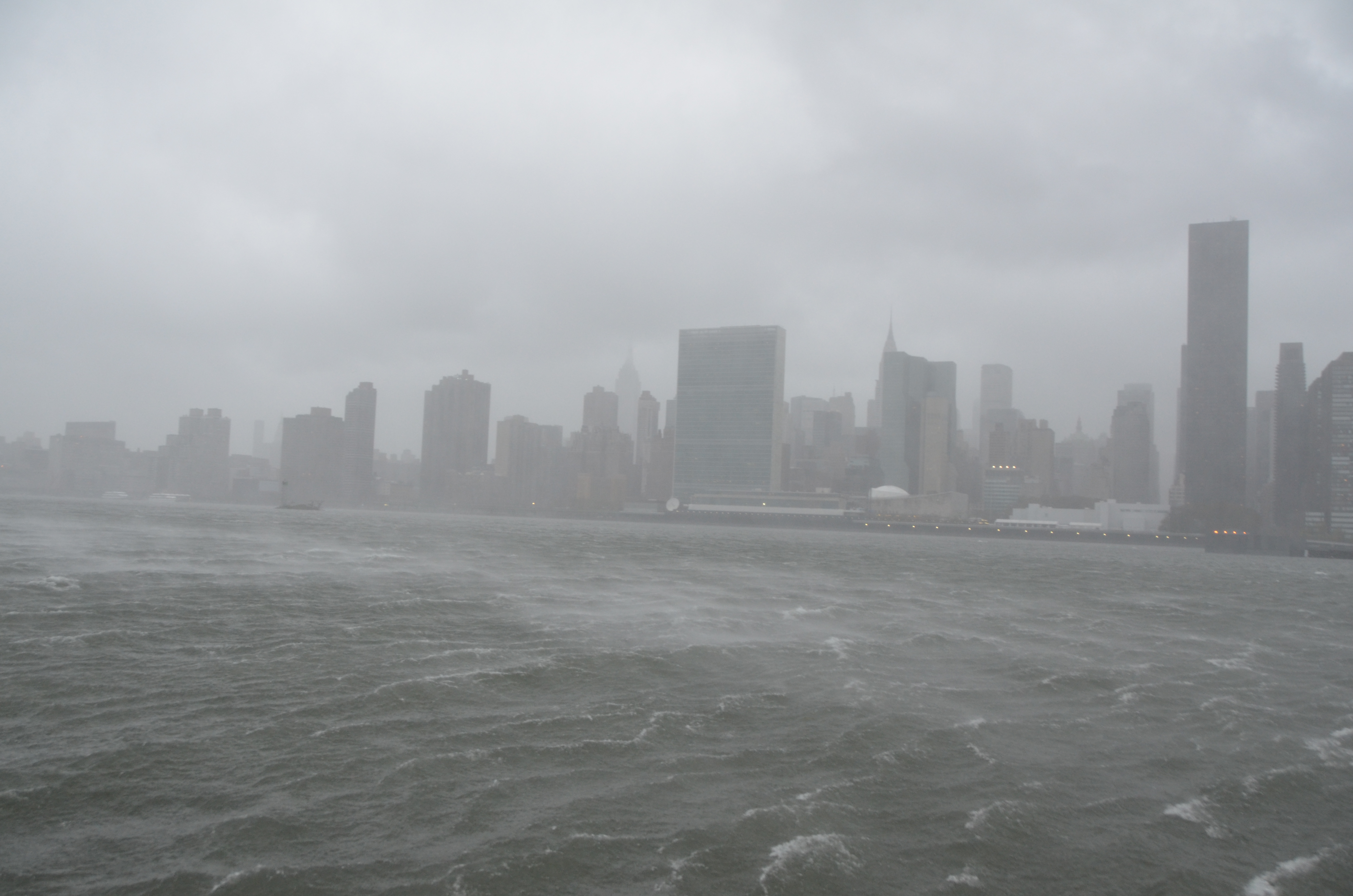 Taken from Long Island City, Queens. I braced myself against a cement bench to prevent myself from blowing away. United Nations, Trump Tower, Empire & Chrysler building in skyline.