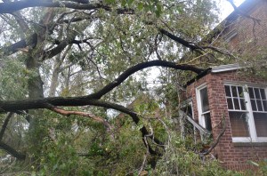WOMAN NARROWLY ESCAPES DEATH: She had meant to cut down that old dead tree in the front yard. But the expense was so great. It was on her ‘to-do’ list. Last night the old tree saved her life. A huge mighty 85 year old elm tree crashed toward her house and is merely resting on the entranceway, barricading her door shut, because the old dead tree acted as a shield and saved her from being crushed in her home.