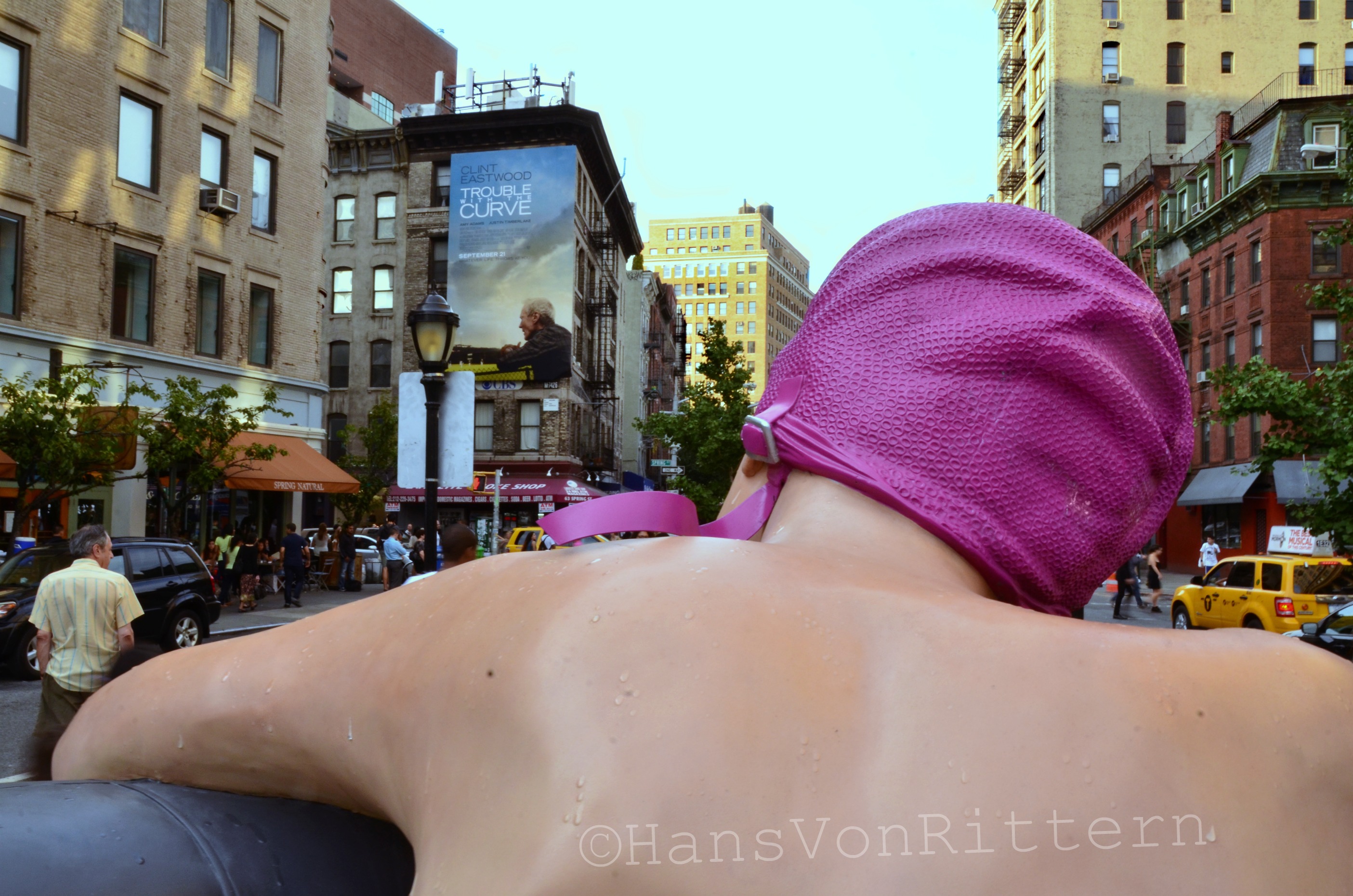 FLOATING: This hyper-realistic sculpture sits in Petrosino Square, the triangular pocket park at the intersection of Soho, Little Italy, and Chinatown. It is by artist Carole Feuerman as part of NYC’s public arts program. It is unbelievably detailed down to the translucent drops of water on her skin – it is called ‘The Survival of Serena’. Here is a link to Carole’s web site, it is astounding: http://www.carolefeuerman.com/