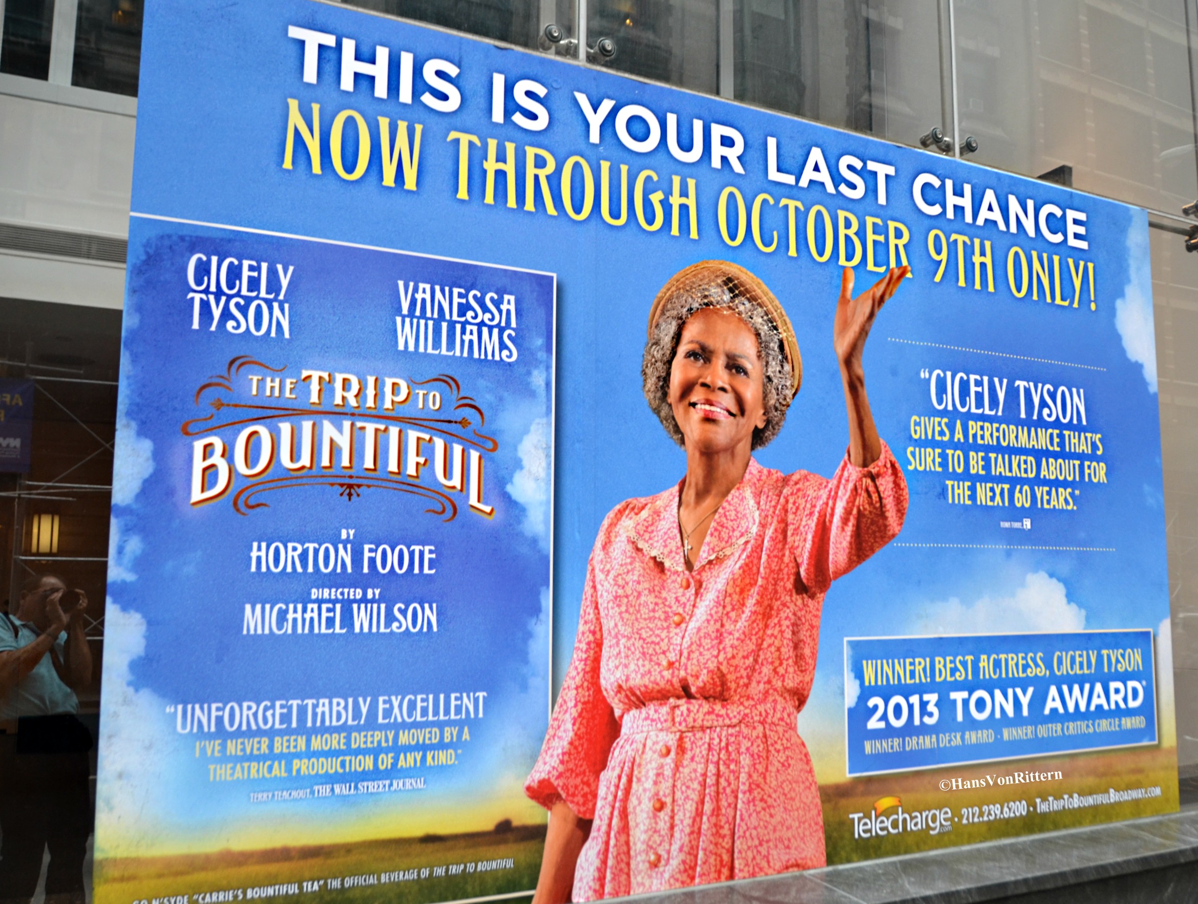October 6, 2013 | Categories: DAILY PHOTOS WITH STORIES OF NEW YORK CITY | Tags: "Blessed Assurance" hymn, "The Trip To Bountiful", 'A Woman Called Moses' - the story of Harriet Tubman, 'Roots', 'Sounder', 'The Autobiography of Miss Jane Pittman', 'The Help', 1953, audience joins in song, black churches, black heritage, Blessed Assurance, Blessed Assurance lyrics, Broadway audience participation, Broadway history, Broadway legends, Carrie Watts, celebrities, Cicely Tyson, Condola Rashad, Elaine Stritch, gospel music, Greyhound bus, Hans Von Rittern, Horton Foote, Houston Texas, ingrid bergman, Jane Fonda, Jessye Norman, Katherine Hepburn, Lillian Gish, Manhattan, memorable Broadway scenes, Mrs. Carrie Watts, New York City, New York photo, nostalgia, Patti Lupone in Evita, Stephen Sondheim Theater, theater legend, theater phenomena, Times Square, Vanessa Williams, wanting to go home again | Leave a comment