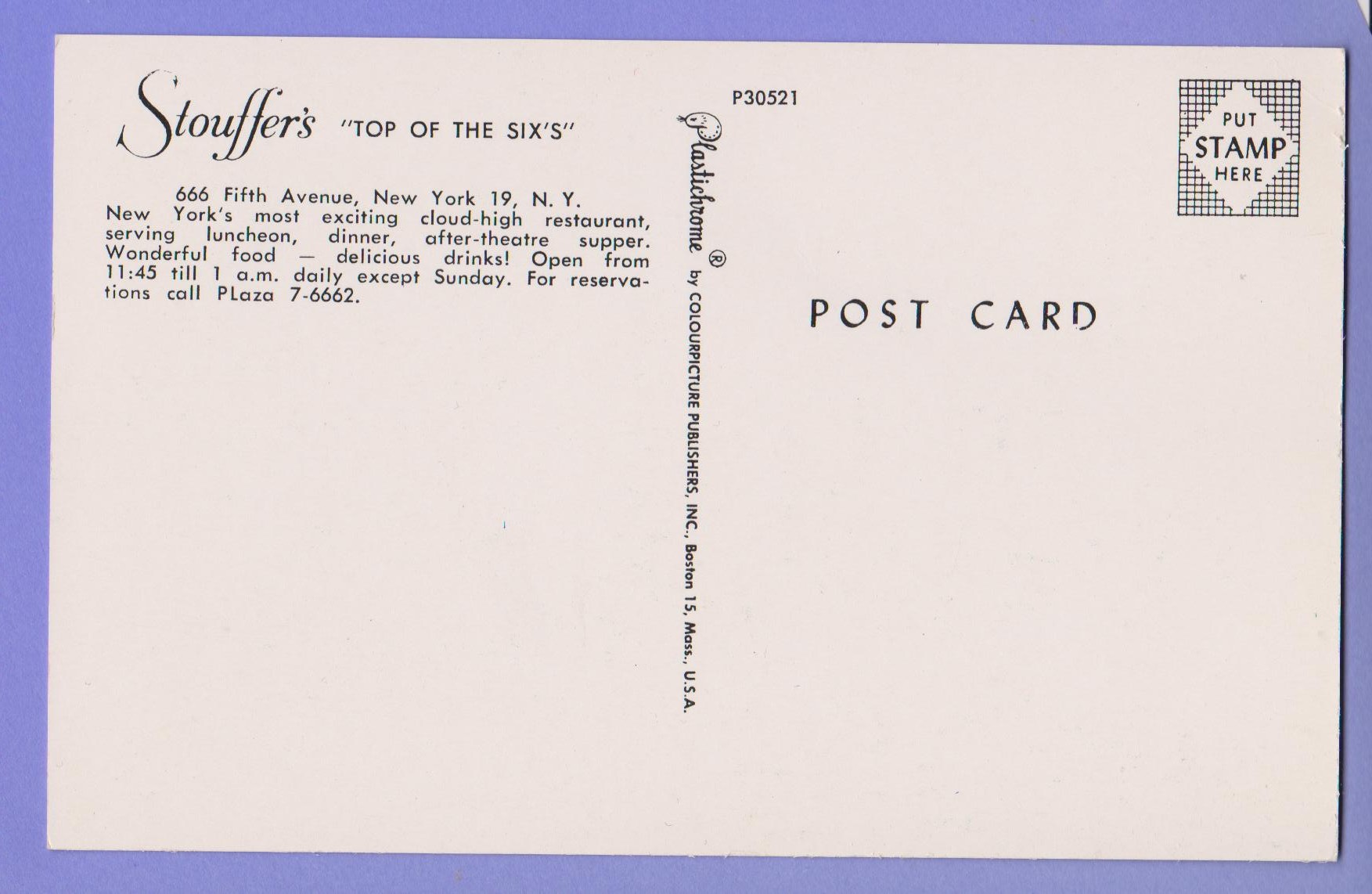 Mondays on Memory Lane: STOUFFERS ‘TOP OF THE SIX’S’ RESTAURANT – As a child, “Top of The Six’s” meant a special occasion. You had done well in school or it was prom night or you were in love and wanted to impress with the sweeping view of the Empire State Building. The rooftop restaurant was located at the epicenter of the posh section of Fifth Avenue, between 52nd/53rd Streets, with a lobby fountain wall designed by Isamu Noguchi and easy subway access downstairs. Today it is but a postcard memory.