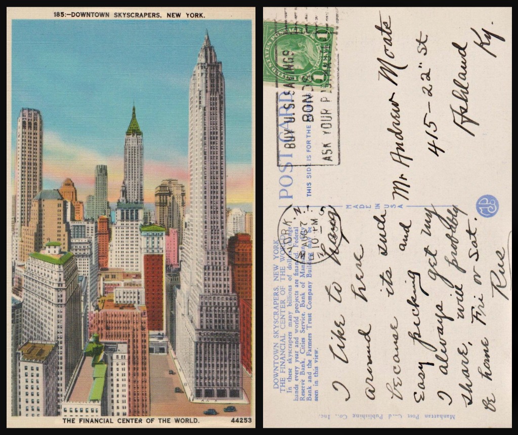 February 13, 2014 | Categories: DAILY PHOTOS WITH STORIES OF NEW YORK CITY | Tags: 1939, architecture, Ashland Kentucky, Bank of Manhattan, Cities Service, City Bank, easy pickings in New York, Farmers Trust Company, Federal Reserve Bank, Hans Von Rittern, letter from a con man, Manhattan, Mr. Andrew Mcate Ashland Kentucky, New York City, New York photo, Photo of the day, postcard from a thief cad scoundrel, Postcard Stories from New York, skyscrapers of old New York, swindler in New York, the financial center of the world, thief in New York, vintage NYC postcard, vintage postcard, written 1939 postcard | Leave a comment