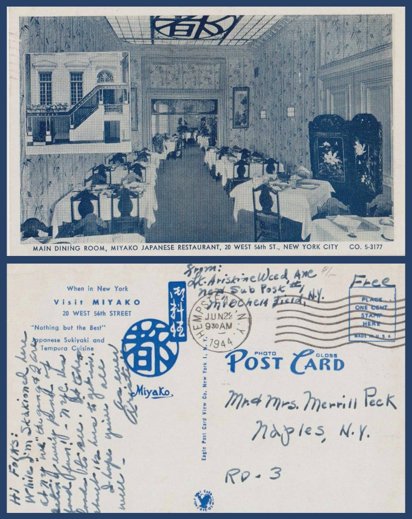 POSTCARD STORIES FROM NEW YORK – AAC LIEUTENANT visits MIYAKO RESTAURANT 1944