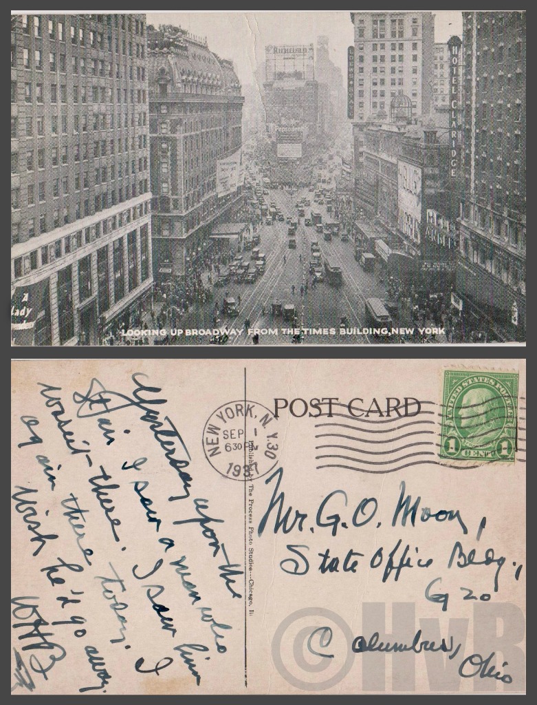 – The postcard itself is a 1930 view of Broadway. Your clues: two signs advertising two hit movies of the year 1930. “A Woman Surrenders” starring Basil Rathbone and Conrad Nagel. And the hugely successful Howard Hughes film “Hell’s Angels” starring blonde bombshell Jean Harlow. It was one of the first ‘talkie’ films.