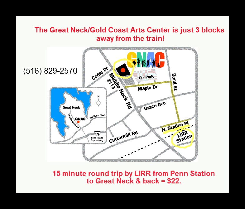 If heading east on Long Island Expressway, take exit 33 and turn north on Lakeville Road. Crossing Northern Blvd. Lakeville Road becomes South Middle Neck Road, then Middle Neck Road. Continue into town, turn right at the 8th traffic light onto Maple Drive. Make your first left into the outdoor Maple Drive parking lot. Entrance to GNAC is in the northwest corner of the lot.