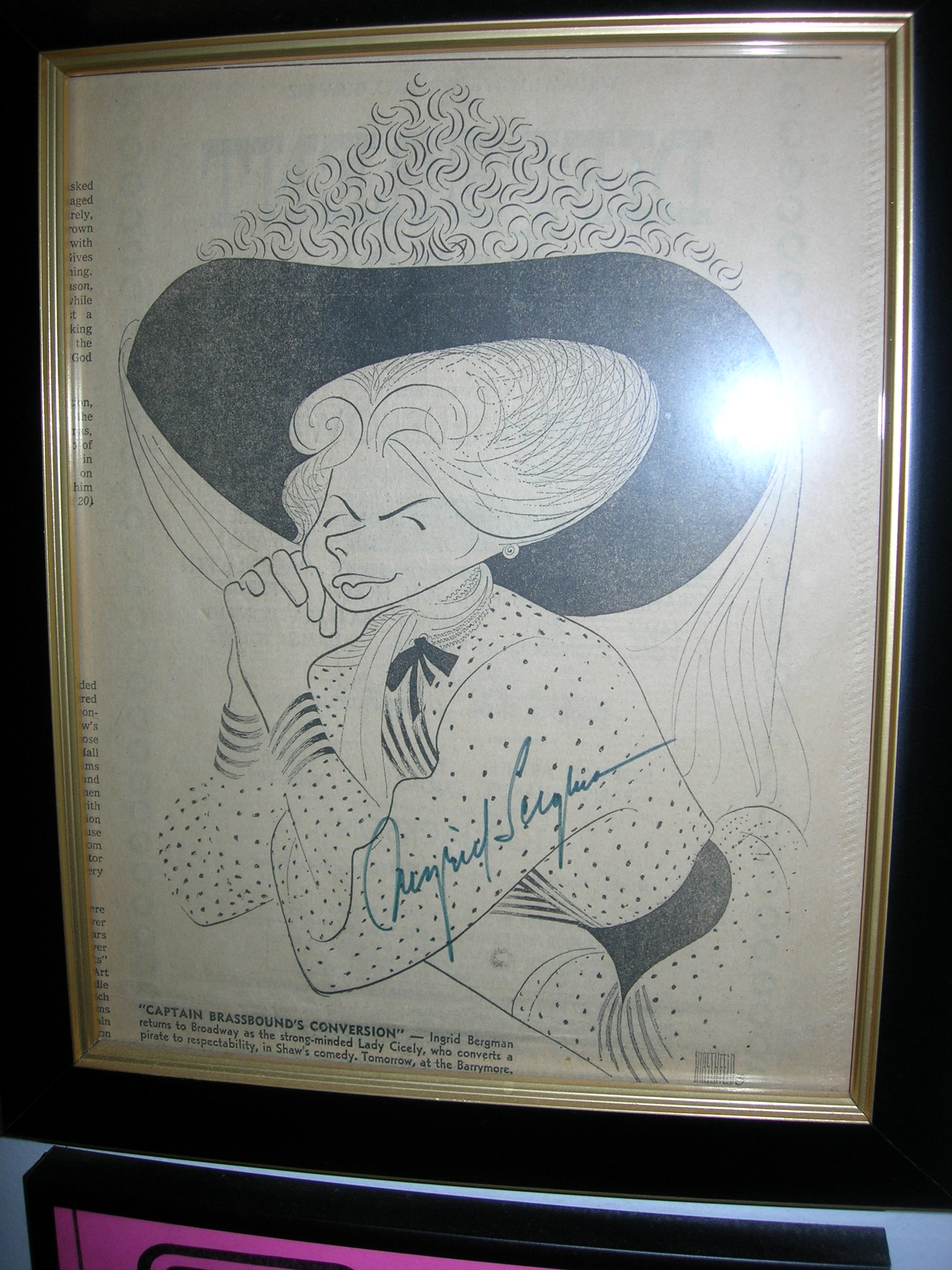 Next to the hallway is ‘the front office’ where two of her staff were busy on the phones. It is filled all the way up to the high ceiling with Hirschfelds that are now part of the American landscape. There was Marilyn, Ella, Bogey, both Hepburns, Sinatra, the Beatles and above the fireplace Margo Feiden’s Hirschfeld portrait. I was agog.