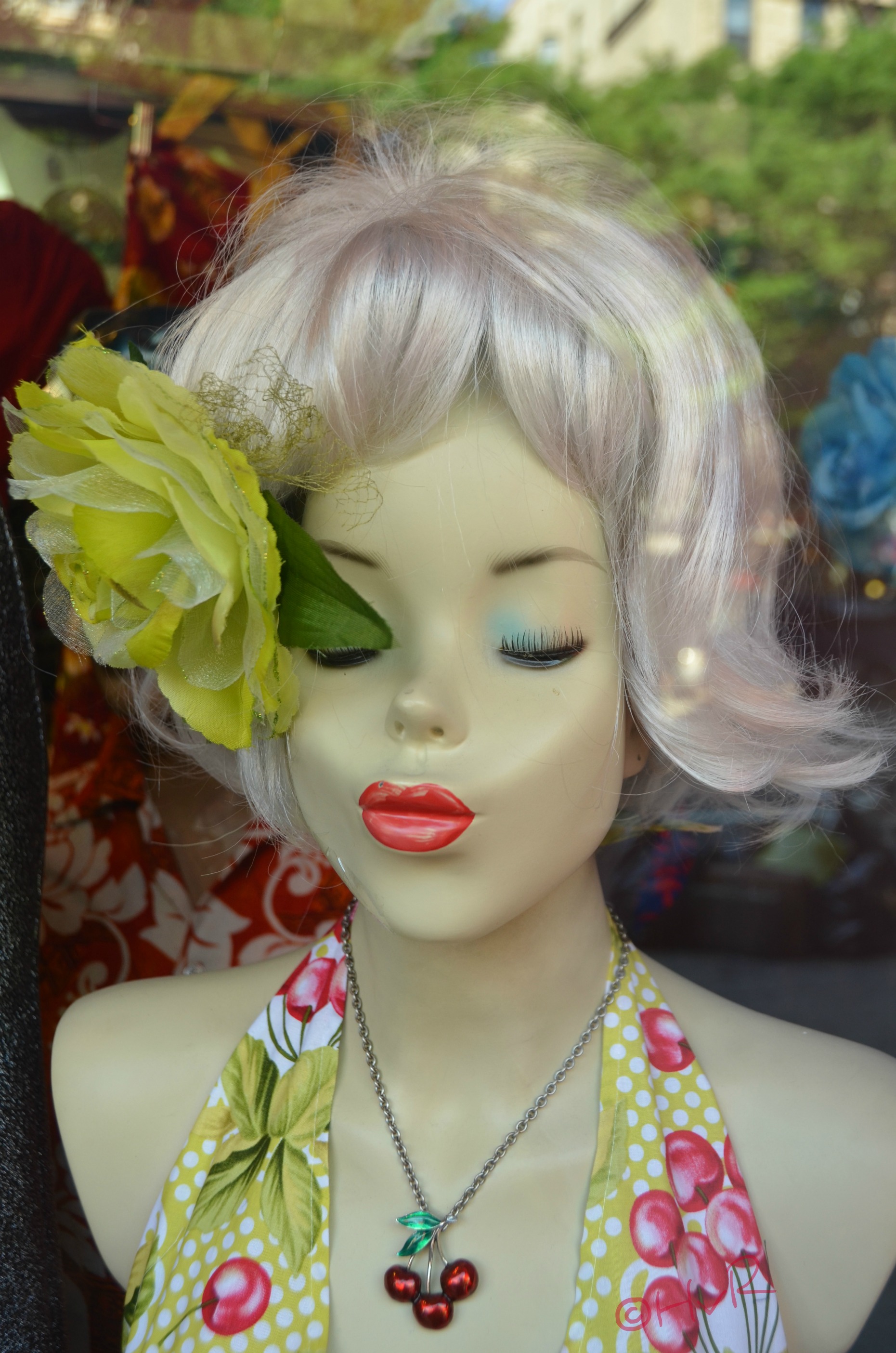 Photo of the day: MODERN DAY MARILYN – The Marilyn-esque look will last forever. I was strolling through the east village and came across MM staring down at me through the window of the wonderful 125 Second Avenue vintage shop “ENZ’S”. This mannequin has so many MM references: the cherries from her ‘The Misfits’ dress, the halter top from the famous subway skirt blowing scene in ‘The 7 Year Itch’, the pouting lips, the droopy eyes and lashes, the famous flip hairdo with an updated color – it’s Marilyn!