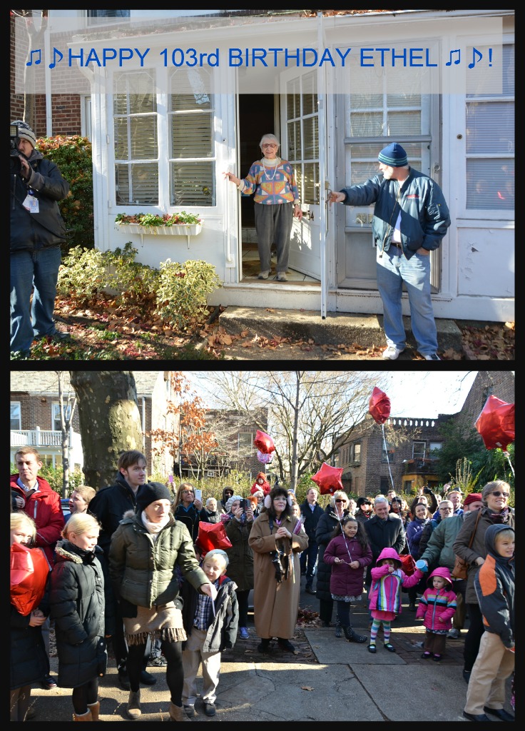 Photo of the day: FLASH MOB SINGS HAPPY 103rd BIRTHDAY/THANKSGIVING TO ETHEL OF SUNNYSIDE ♫♪ ! – My neighbor and art patron Ethel Plimack celebrates her 103rd birthday today!! Thanksgiving + Hanukkah + 103 years! WOW! Fellow neighbor Patricia Dorfman and member of the Sunnyside Artist League organized a flash mob for 11:59am today when neighbors and their children appeared on Ethel’s doorstep and sang a special “Happy Birthday” to her! What a special day !